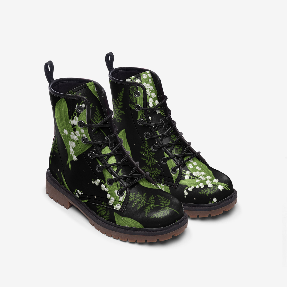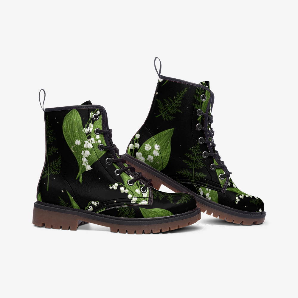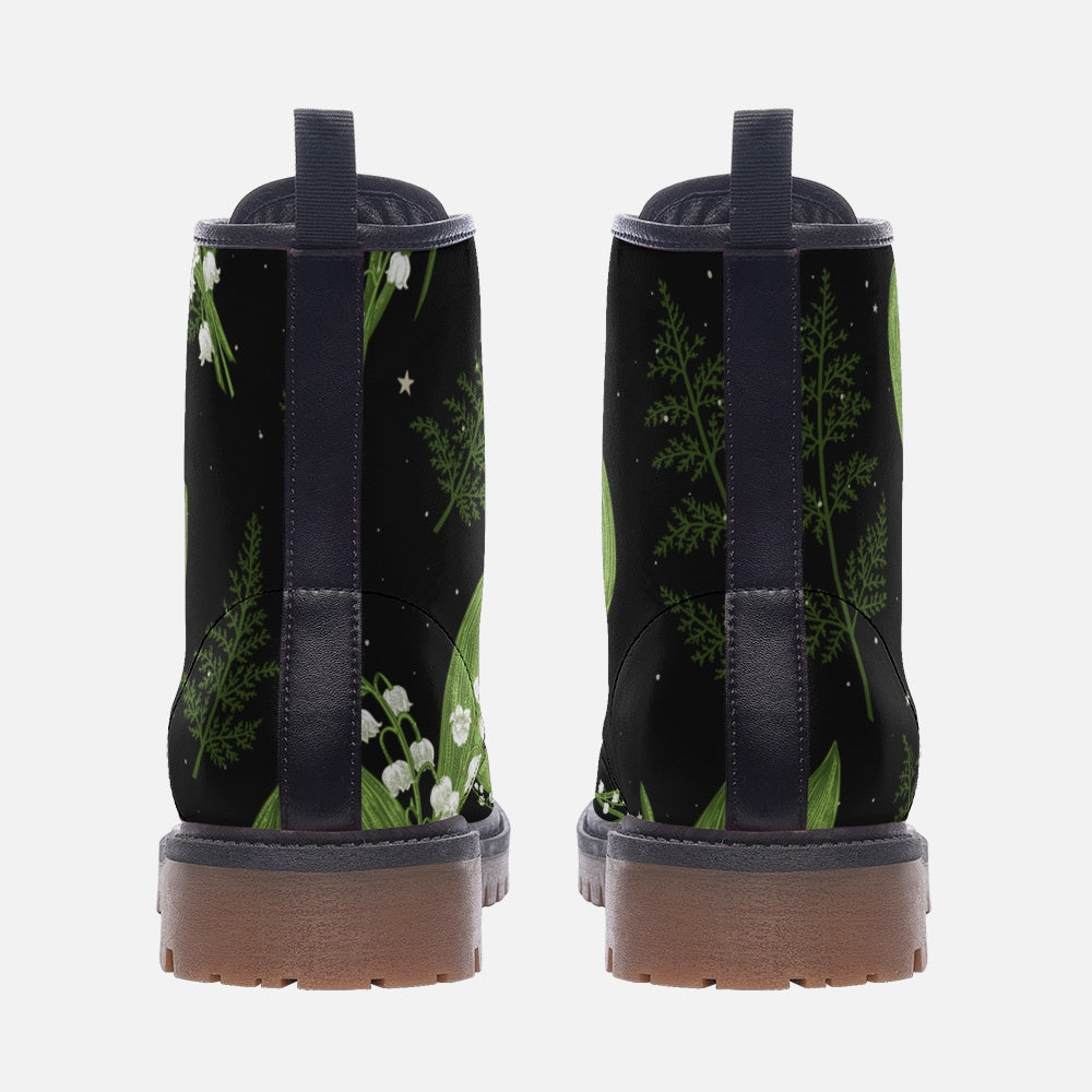 Celestial Lily of The Valley Aesthetic on Black Vegan Leather Combat Boots