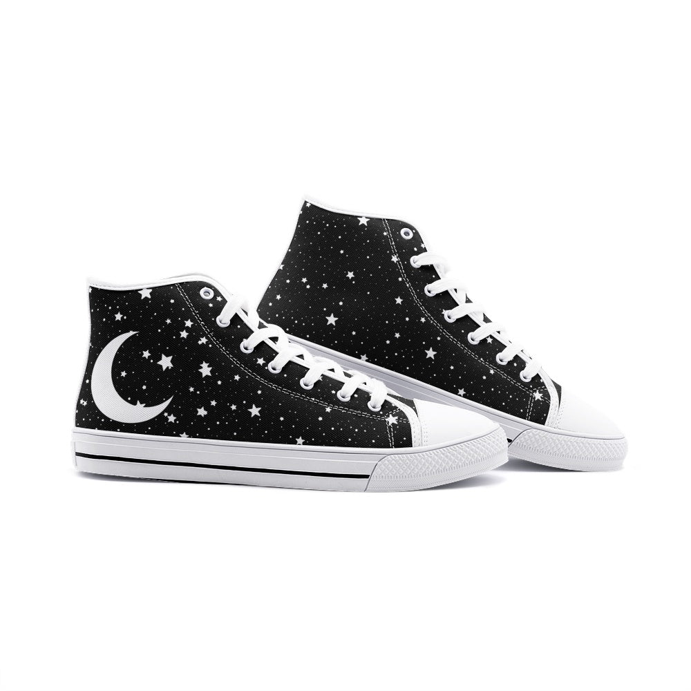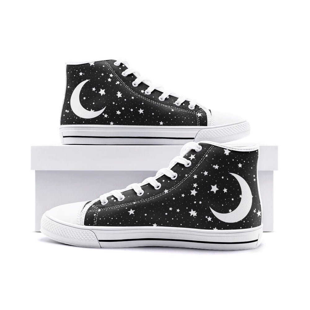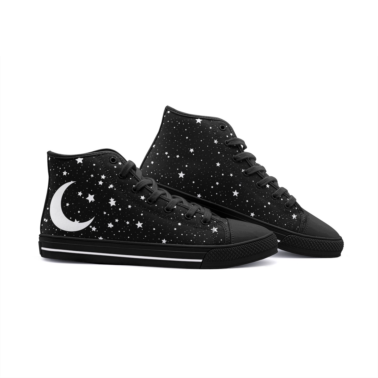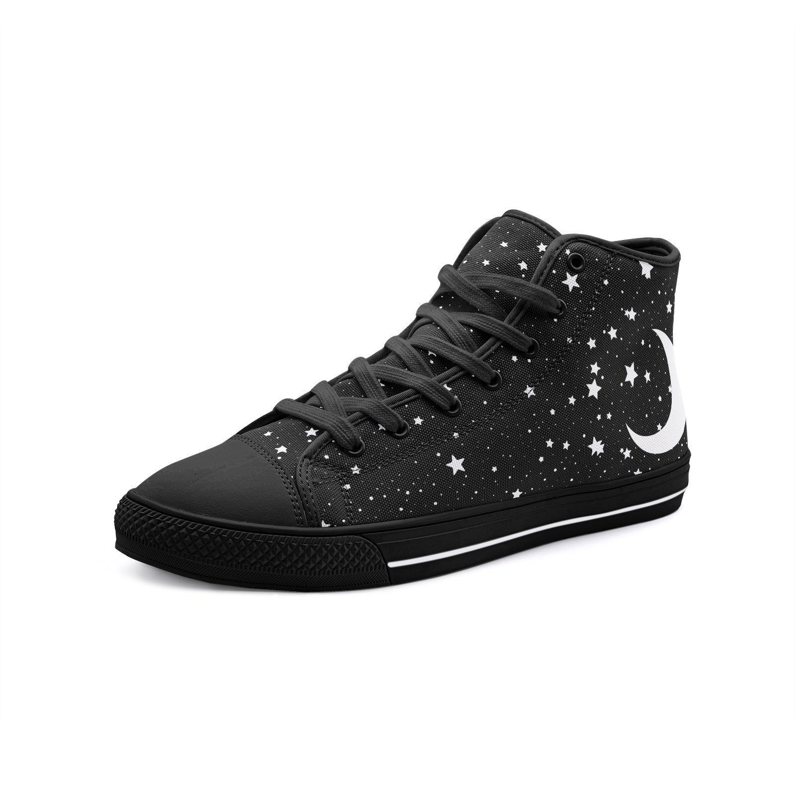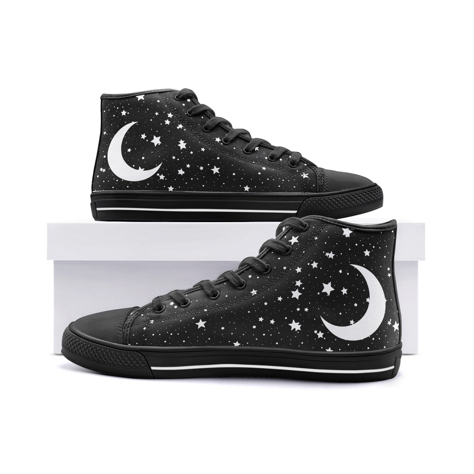 Thousand Stars and Crescent Moon on Black High Top Vegan Canvas Shoes